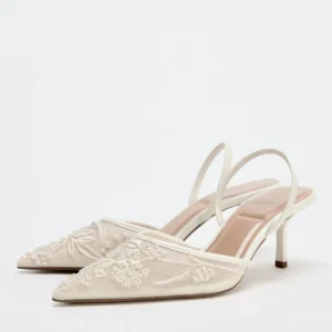 $12.37 – $21.07BlackBeigeClear353637383940TRAF White Embroidery Mesh Stiletto Pumps New French Style Thin Heel Slingbacks For Woman Summer Point Head Sandal Women’s Shoes