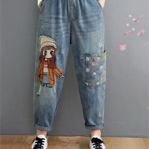 $62.35 – $70.69Army GreenLXLXXLXXXLMSClearCHINA6537 Cartoon Litter Girl Embroidery Denim Pants For Women Trendy Hole Casual High Waist Breeches Pockets Mom Harem Blue Jeans