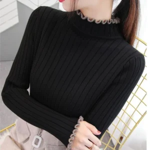 $18.41472 Black472 Grey472 Pink472 White472 Wine472 YellowClearLXLMSHalf High Collar Long Sleeve Shirt Pullover Female Knitted Sweater S-XL Girl Stretch Flowers Lace T Shirt Women Tops Clothes