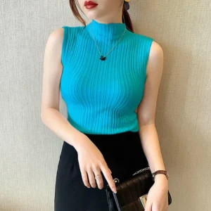 $17.96457 Black457 Blue457 Camel457 Coffee457 Green457 Navy457 Orange457 Pink457 Purple457 Red457 Taro457 White457 YellowClearLXLMSPurple Blue Orange Green Yellow Knitting T Shirt Solid Slim Thin Sleeveless Vest Half High Neck Shirt Women S-2XL Sweater Tops