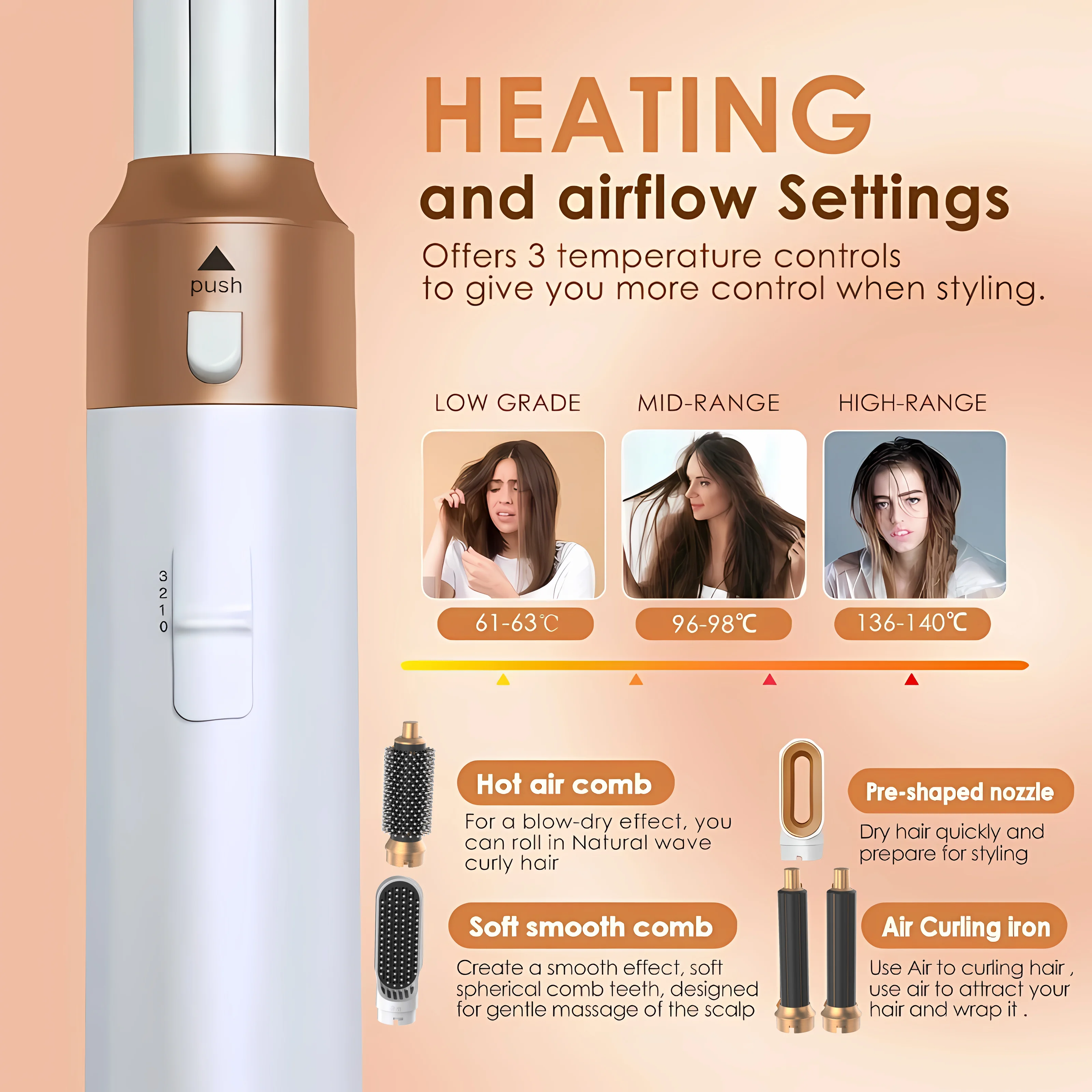 Three Different Temperature Gears: Adjustable heat settings.