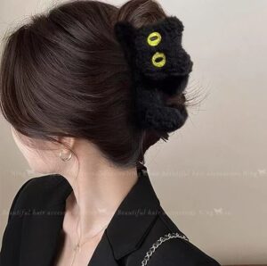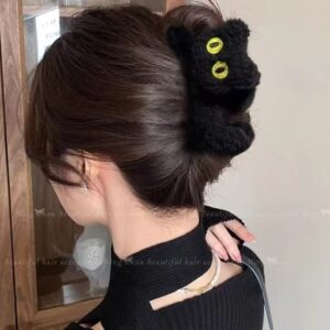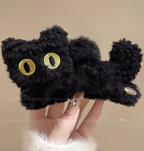 This black cat hairpin is designed with the inspiration of a lifelike black cat doll, cleverly incorporating it into fashionable hair accessories. The doll’s eyes are embroidered with golden threads, sparkling with a charming yellow glow, as if giving the cat life and vitality. Its ears and tail maintain the consistent black tone, perfectly blending with the fluffy black fur of the body, displaying a cute yet elegant demeanor.