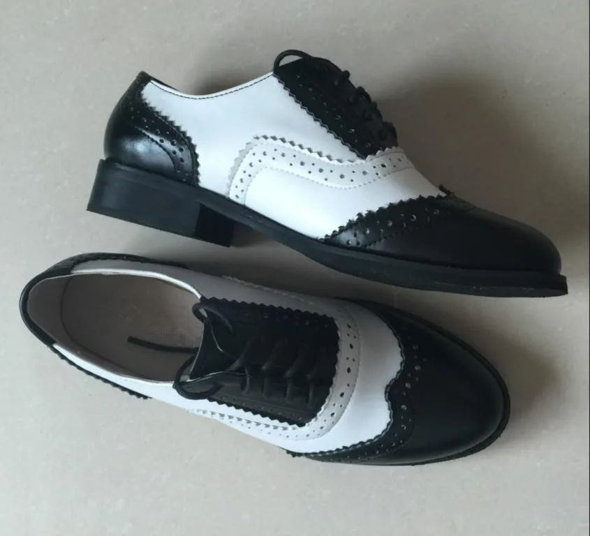 Four Seasons Hot Genuine leather Black+white sapato women oxford shoes leisure Derby Flat shoes Wing Tip Shoes