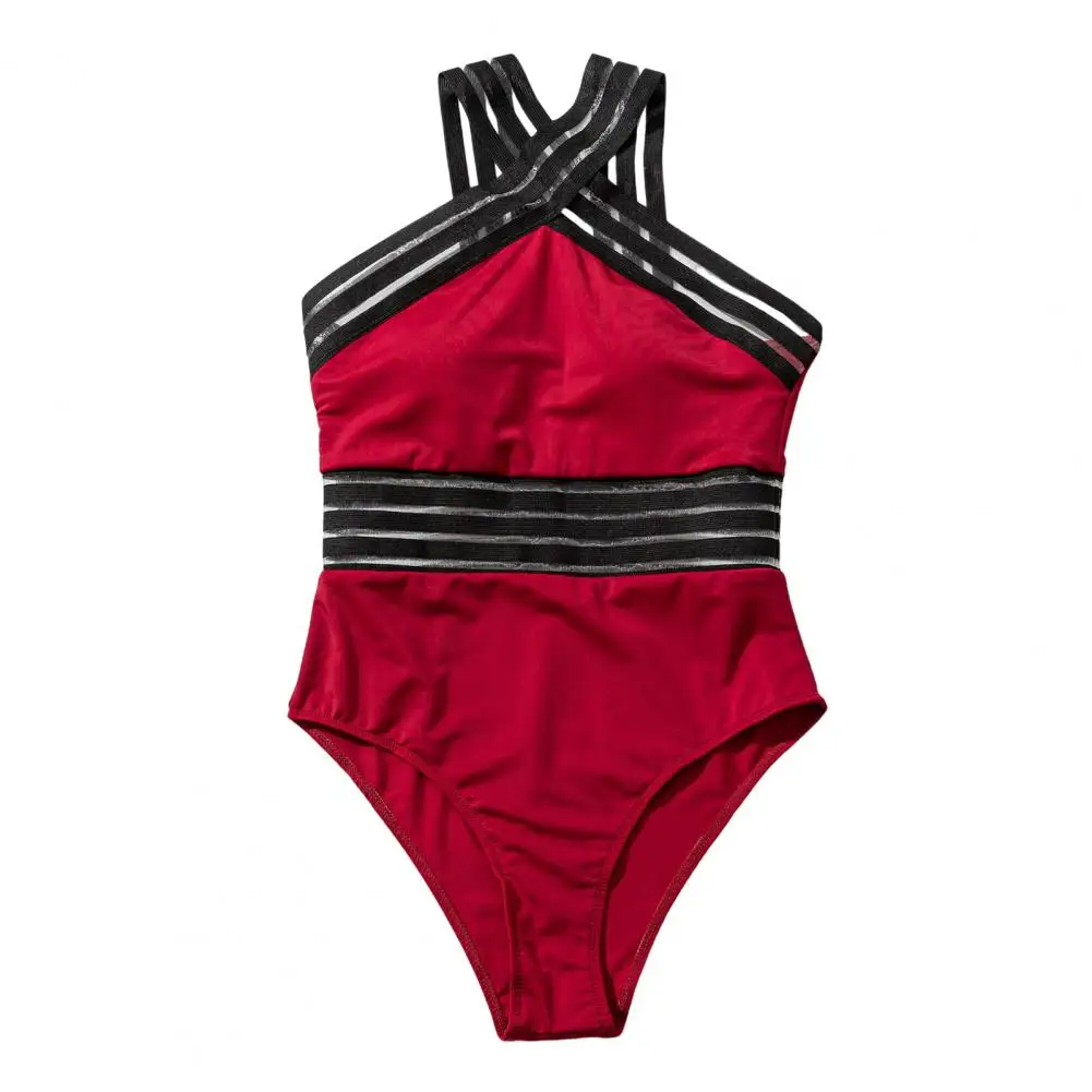 One-piece Swimsuit Stylish Mesh Splicing Monokini Swimsuit for Women High Waist S-shaped Swimwear with Halter Neck for Summer