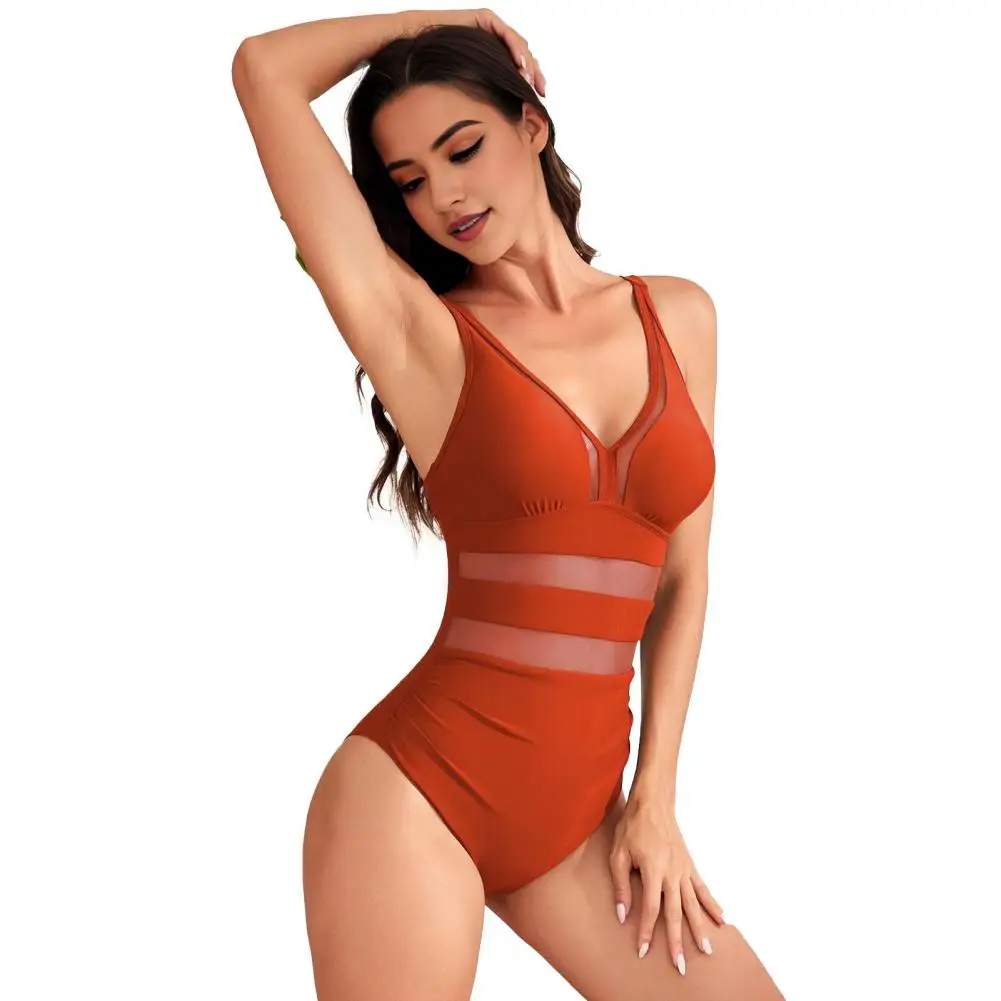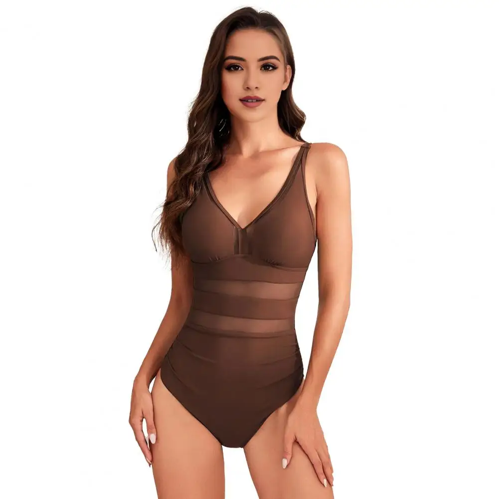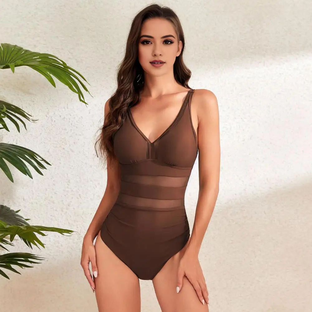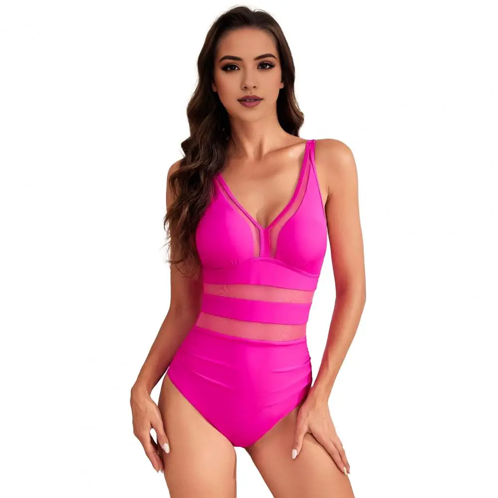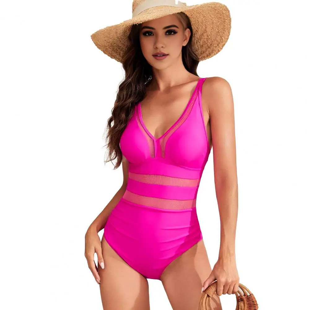 One-piece Swimwear Stylish Women’s Mesh Splicing One-piece Swimsuits V-neck Beachwear with Tummy Control High Waist S-shaped