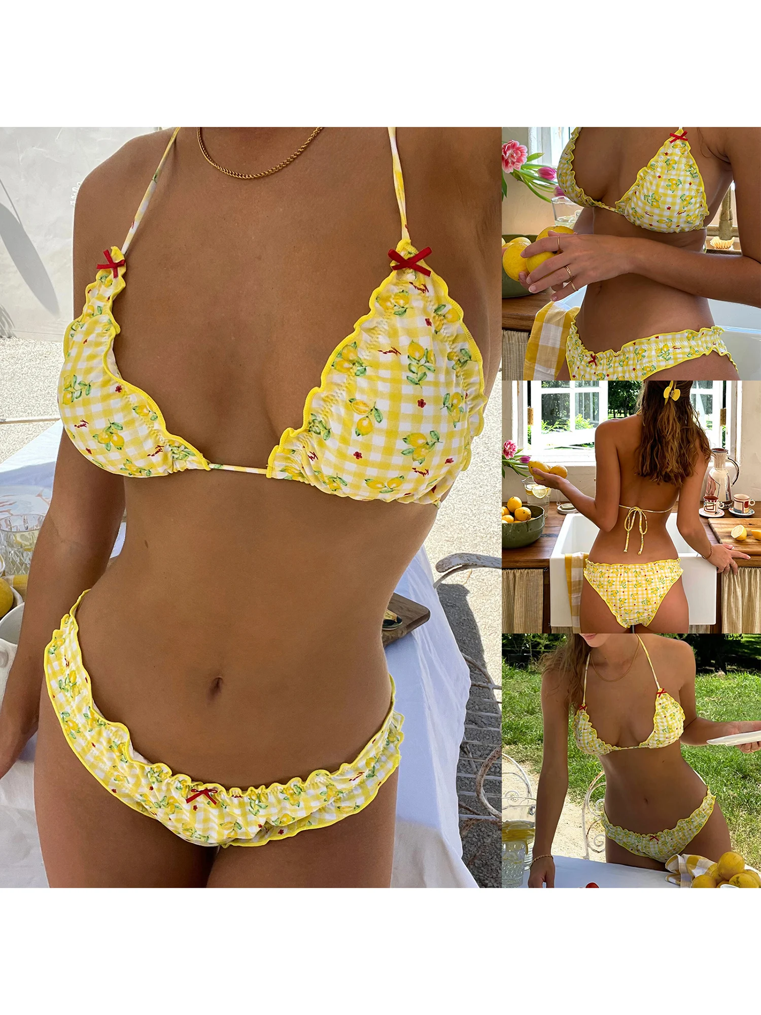 2-Piece Womens Bikini Sets Lemon Plaid Print Bow Lacy Halter Neck Back Lacing Bathing Suit