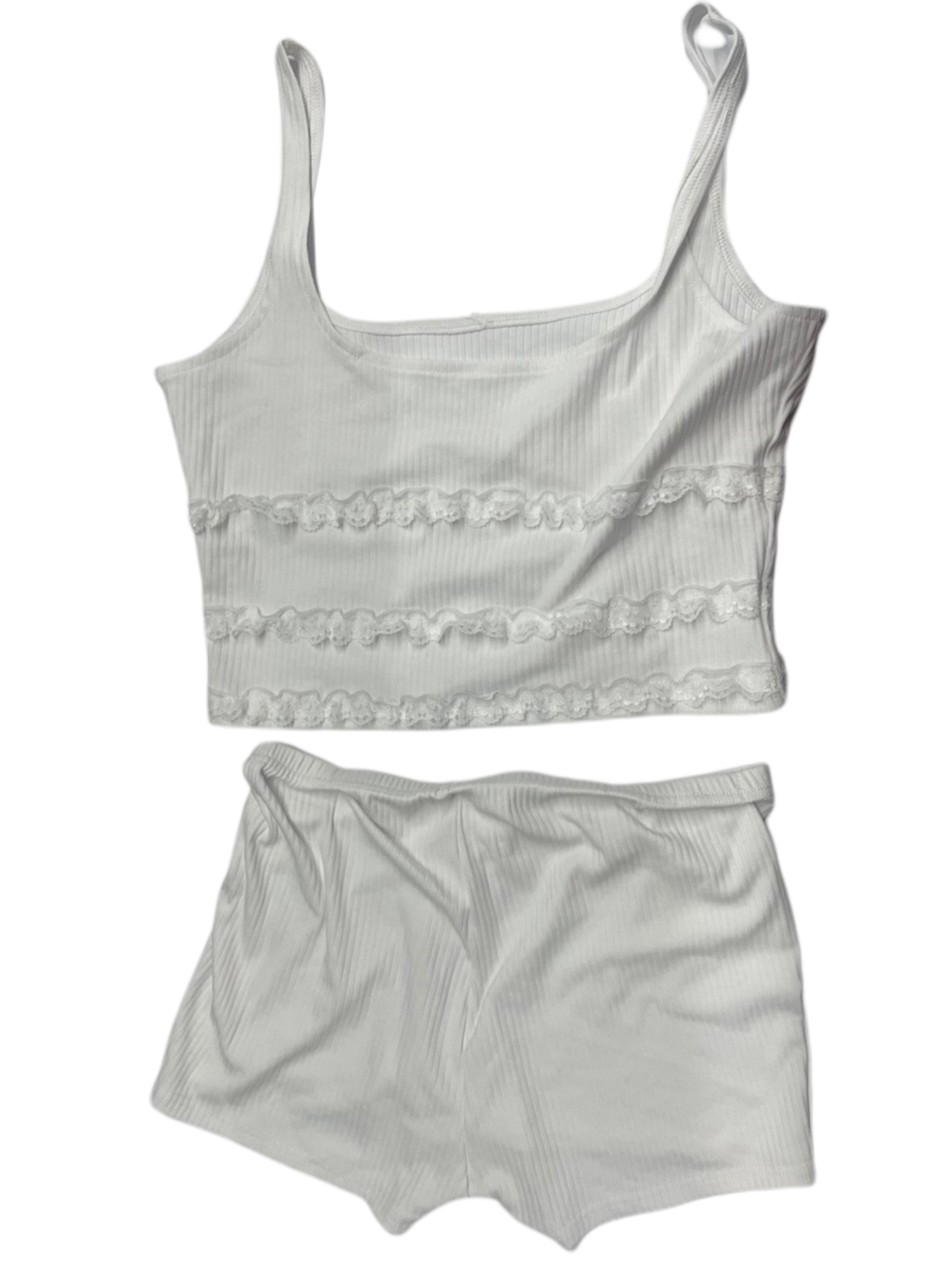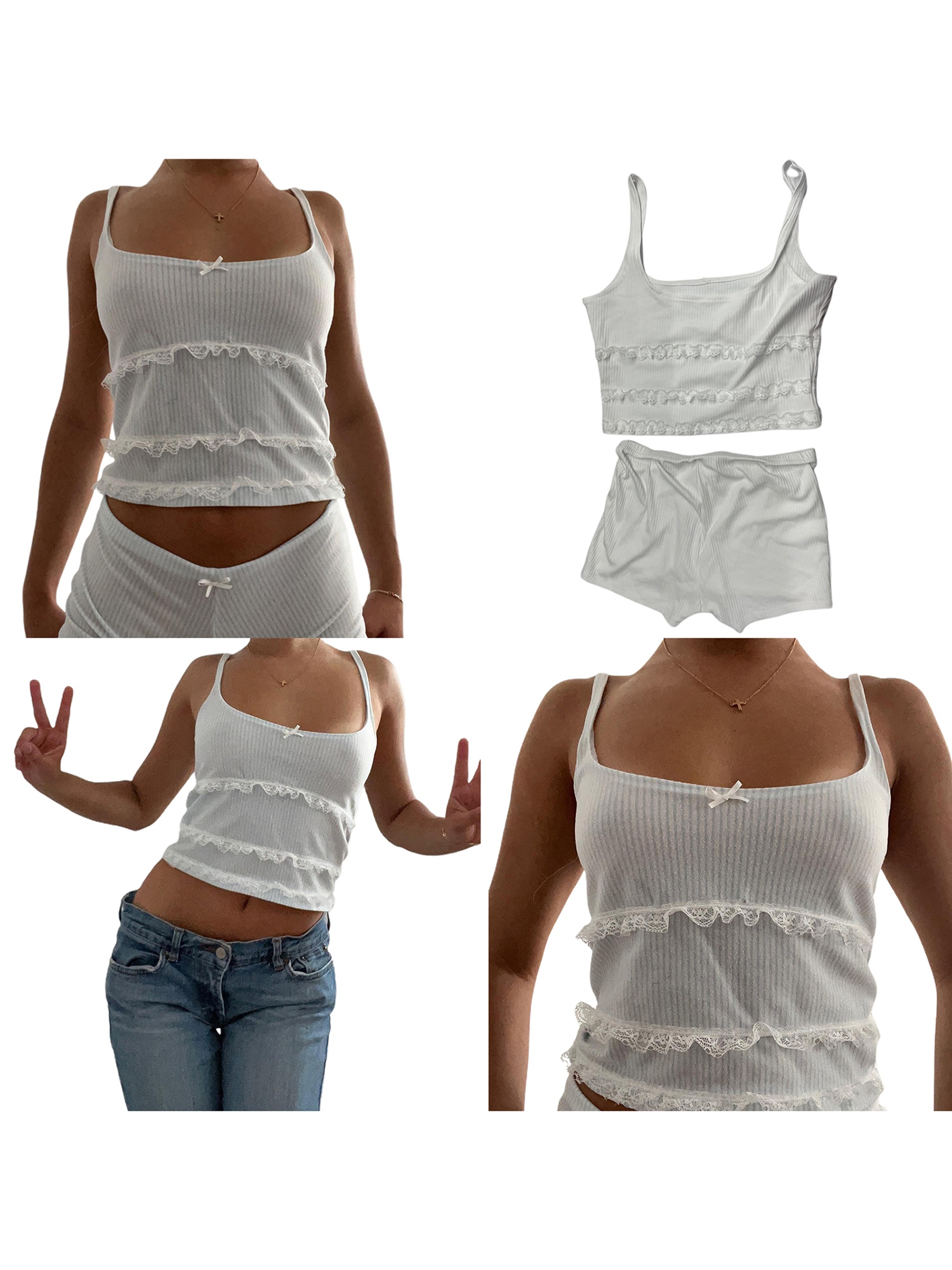 Women Summer 2 Pieces Clothes Outfits Solid Color Lace Trim Camisoles Sleeveless Sling Tank Tops and Elastic Waist Shorts Set