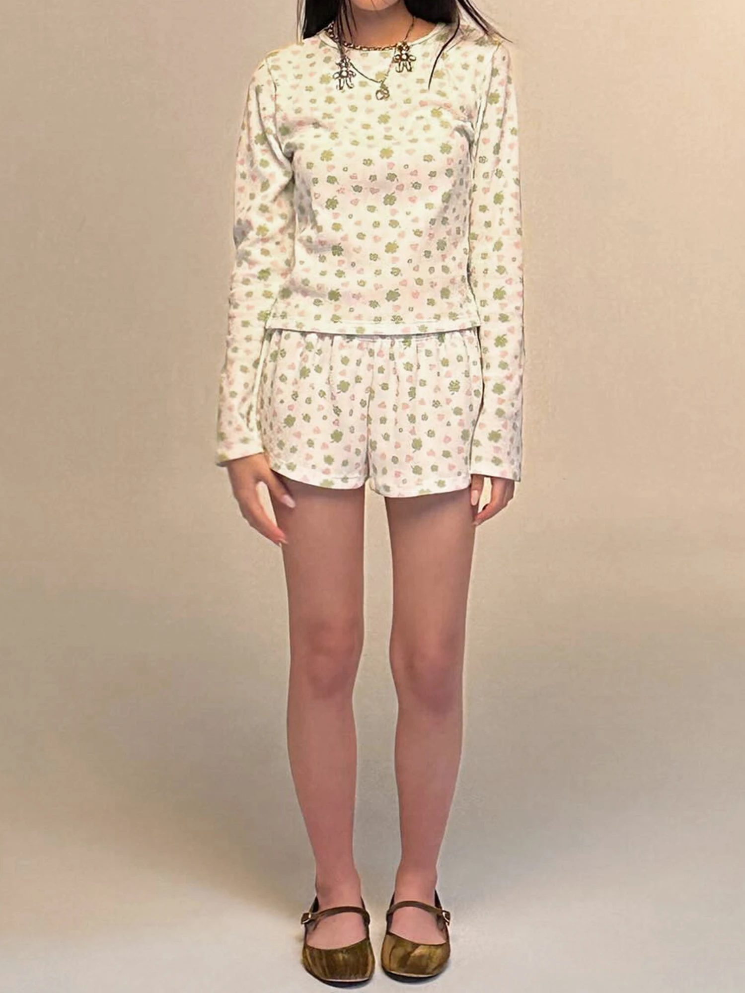 Floral print, fashionable casual style. Women’s T-shirt with long sleeves and round neck design. Women’s shorts with elastic waist for easy fit.