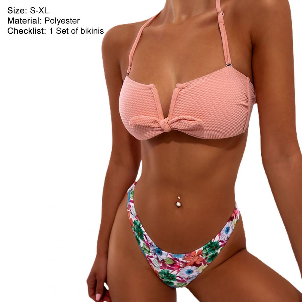 2 Pcs/Set Women Bikini Set Halter Neck Colorful Floral Print Lace Up Bathing Suit Water Sports Garment