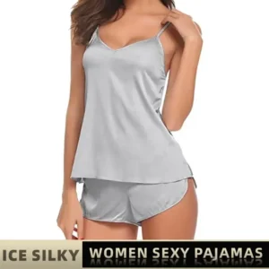 $13.42 – $14.02BlackWhiteRedClearLXLXXLXXXLMSWomen Sexy Ice Silky Pajamas Camisole and Shorts Sling Sleepwear White Black Gray S/M/L/XL/2XL Comfortable Casual Nightwear